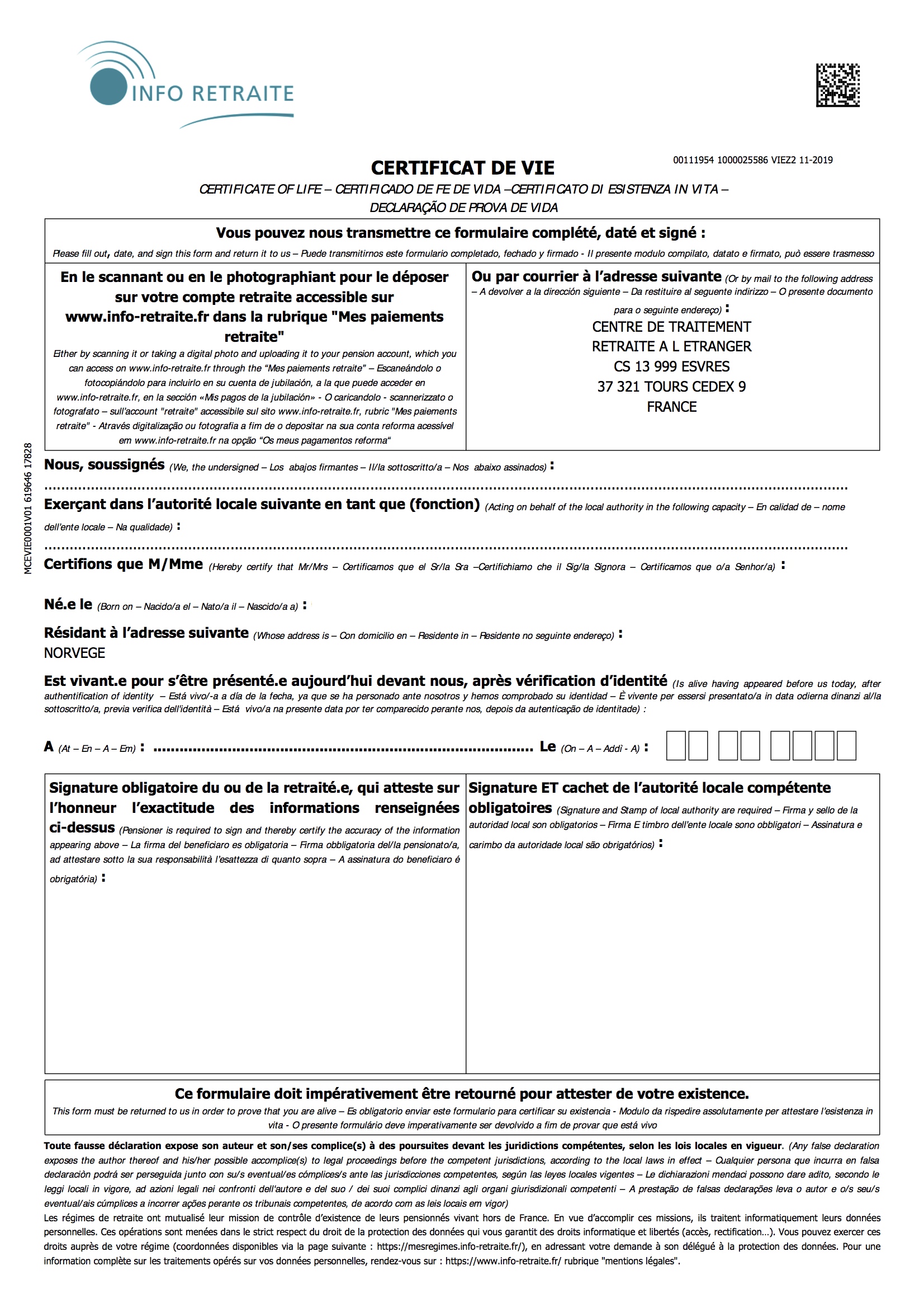 Attention, pour pouvoir toucher la part française tout en résidant en Norvège, il vous faudra faire remplir un fois par an un certificat d'existence. On veut s'assurer que vous êtes toujours vivant. Les certificats de vie ou attestations d'existence exigés par les caisses de retraite en France pour le versement de votre pension, quelle que soit votre nationalité, doivent (en Norvège) être établis exclusivement par les autorités norvégiennes compétentes, à savoir le Notarius Publicus, au sein des tribunaux (63 cours de justice en Norvège: Bekreftelsen gis av notarius publicus. I Norge er tingrettene og Oslo byfogdembete notarius publicus. Notarius publicus bekrefter at du lever. For å få denne bekreftelsen, må du møte personlig og vise gyldig legitimasjon og dokumentet hvor notarius publicus skal bekrefte at du lever. Gyldig legitimasjon er pass, førerkort utstedt i Norge (bankkortstørrelse) eller bankkort med bilde utstedt i Norge. Nasjonalt ID-kort fra andre land er ikke gyldig legitimasjon hos notarius publicus. Du trenger timebestilling i Oslo, alt gjøres i tingrettens ekspedisjon mens du venter. Å få en notarialbekreftelse koster rundt 300 kroner. Si vous êtes en vacances en France, faites remplir et tamponner le papier à la mairie de votre lieu de vacances. Pour voir à quoi ressemble ce certificat. Version papier à envoyer au Centre de traitement CV, CS13999 Esvres, 37321 Tours Cedex 9. Version scannée à déposer sur le compte retraiteà www.info-retraite.fr. Problème pour l'envoyer ou autre: tél. à la CNAV, au numéro spécial pour ce service: du lundi au vendredi de 8h à 17h , au 09 74 75 76 99.